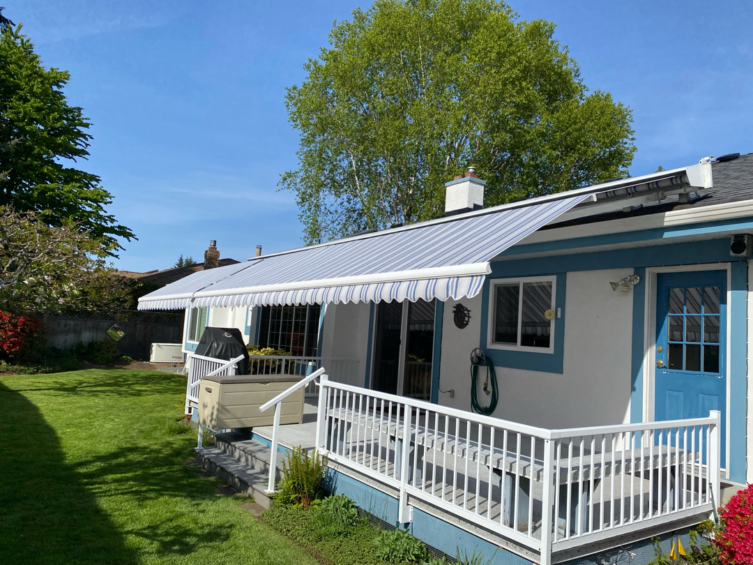 This 21′ wide custom motorized retractable awning is a premium outdoor shading solution designed to provide expansive coverage with timeless style. Featuring a clean white frame paired with L-561 beige and blue striped fabric, it delivers a classic look that complements a wide range of outdoor spaces.